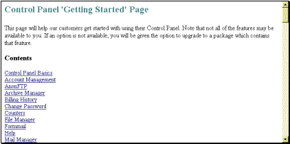 3. Select the Getting Started link to open a page of general help related to all of the icons on the control panel. The Control Panel ‘Getting Started’ Page displays a list of contents. |