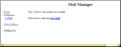 3. At this point, the new user mail account can be edited, or you can return back to the Mail Manager home. To return to the Mail Manager home, select the Home link. If you would like to return to the main Control Panel page, select the Control Panel link located in the upper right corner of the top frame. If you would like to edit the newly created account, click the link of the user name whose account you would like to edit and continue with the next procedure. |
