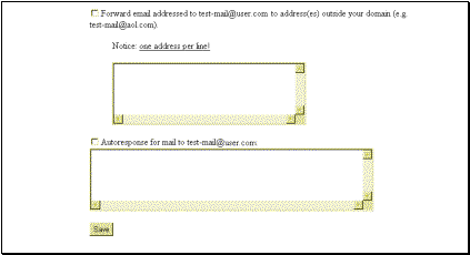 3. After selecting the appropriate mail forwarding option, you may also manually type text in the auto-response text entry box. If you choose this, be sure to select the Autoresponse for mail to… option. Any text you type in the space provided will automatically be sent to anyone who sends e-mail to the address you are currently editing. |