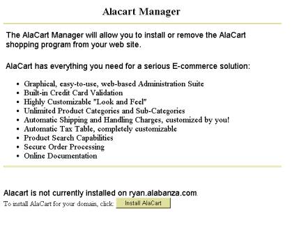 The AlaCart Shopping Cart option is an easy-to-use e-commerce utility you can install on your site. It allows you to sell merchandise on your site and gives your customers a user-friendly way to quickly find and purchase merchandise. Additionally, new features for the AlaCart Shopping Cart are being developed which will further enhance the capabilities of this resourceful tool.