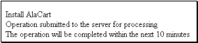 2. Select the Install AlaCart button. A message displays indicating that AlaCart will be installed within approximately ten minutes. |