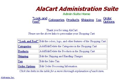 1. Follow the link provided in the final step of the previous procedure (located underneath the statement To setup the Shopping Cart, go to:). The link will contain the text: s-cart/admin/index.phtml. The AlaCart Administration Suite page displays. |