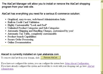 Once you have installed the AlaCart Shopping Cart, you will need to configure it for your site before you are able to administer and use it.