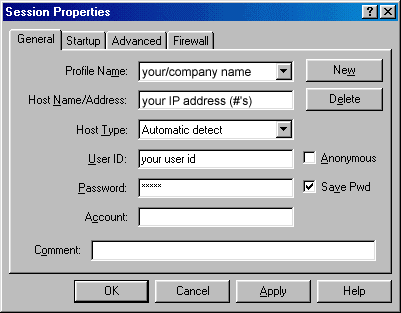 No matter what FTP program you use, you will need to know the above three items in order to connect to your account. Below are screen shots that show how to set up WS_FTP so that you can use it for access to your site. Leave ‘Host Type’ on ‘Automatic detect’. ‘Profile Name’ can be anything you wish, but is usually set to your name or your company name. Leave all other settings on default. |