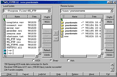 Within 15 minutes after ordering your new domain from benchmarkhosting.com, you will receive a Welcome letter that contains your IP address, username, and password. You can now start uploading files into your site by using the IP address. This allows you to get your site ready while you wait for your domain name to be registered or transferred. You can use any of several programs for site development. If you use our Sitebuilder Software, please see the instructions for using it before getting started with it. If you use Macromedia Dreamweaver, you can use the integrated FTP client to upload your files to your site. Netobjects Fusion also has an integrated FTP client. In either case, the FTP instructions/example below provides you with the information you need to set up the FTP client. Note to Microsoft FrontPage Users: If you use Microsoft Frontpage, you need to go to your Control Panel and select the icon to install Microsoft Frontpage server extensions. If you choose to do this, you should use the Frontpage publishing feature to publish your files to your web. You should not use FTP. Use of FTP on a Frontpage web can corrupt the server extensions and disable the functionality of your Frontpage web. This in turn requires that your site be deleted so that the Frontpage server extensions can be re-installed. There are a number of FTP (File Transfer Protocol) programs on the market that can be used to upload your files. If you are operating in the Windows environment, we suggest using WS_FTP (available at http://www.ipswitch.com). If you use a Macintosh, we suggest using Fetch (available at http://www.dartmouth.edu/pages/softdev/fetch.html). When using any type of FTP program there are three key things to keep in mind when connecting to your account.